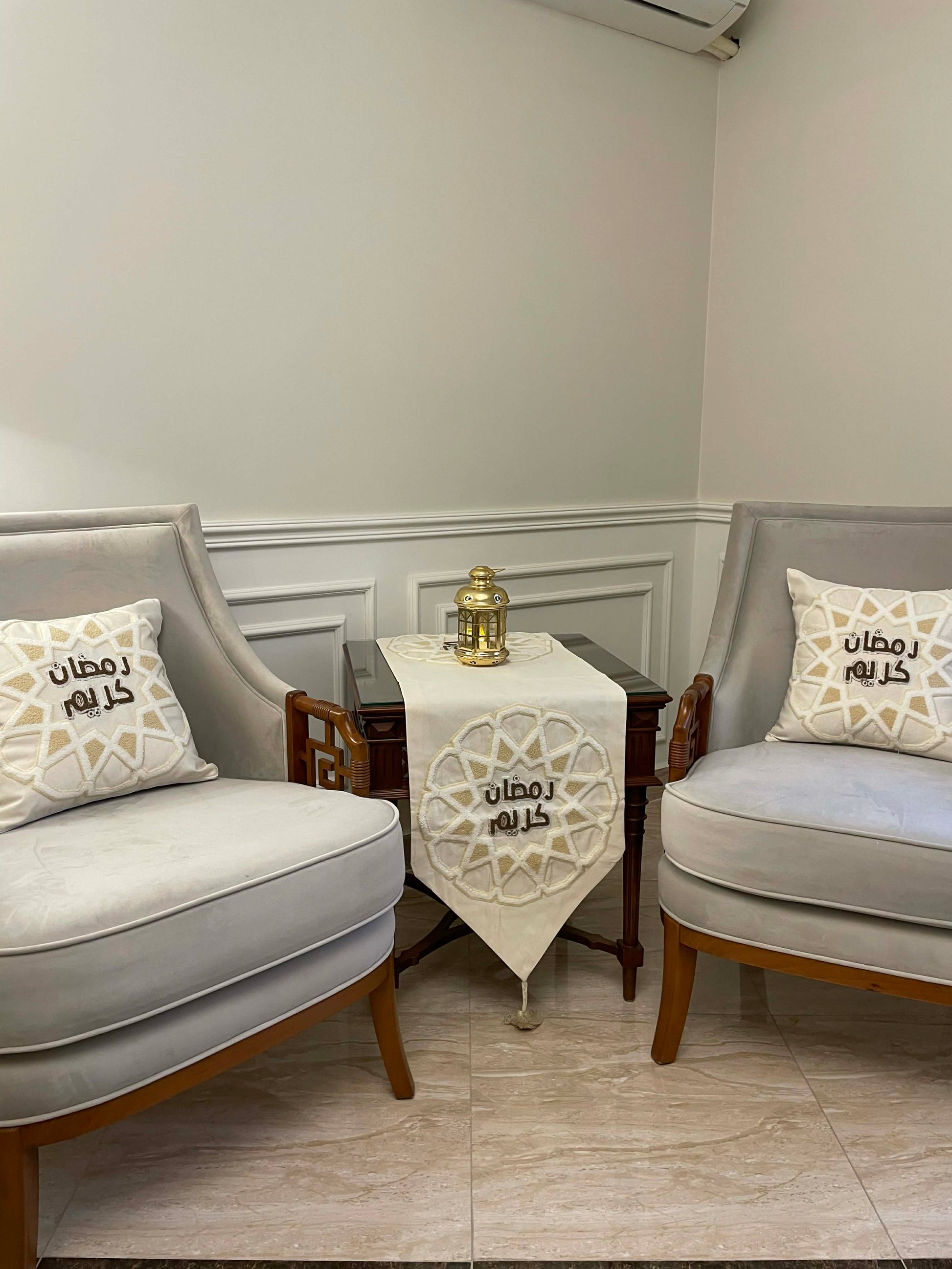 Ketan Embroidered set consists of a runner & 2 cushions.